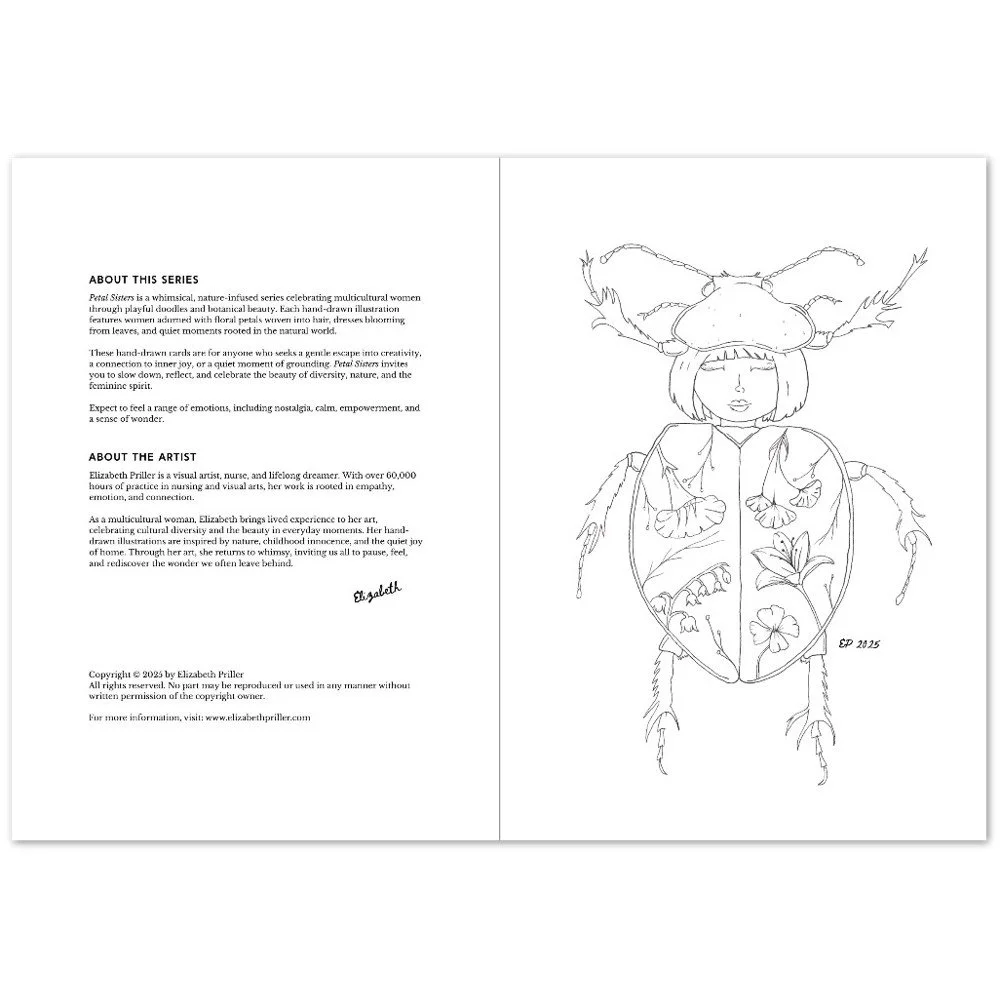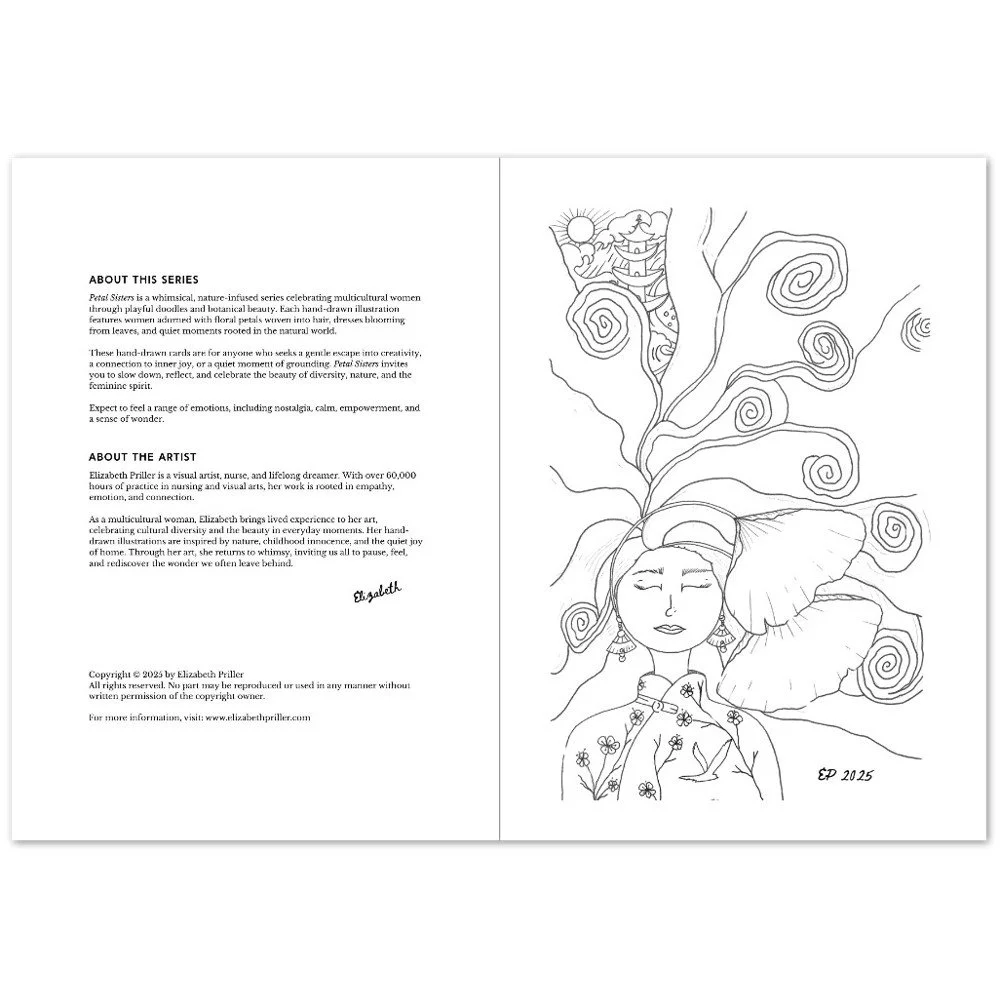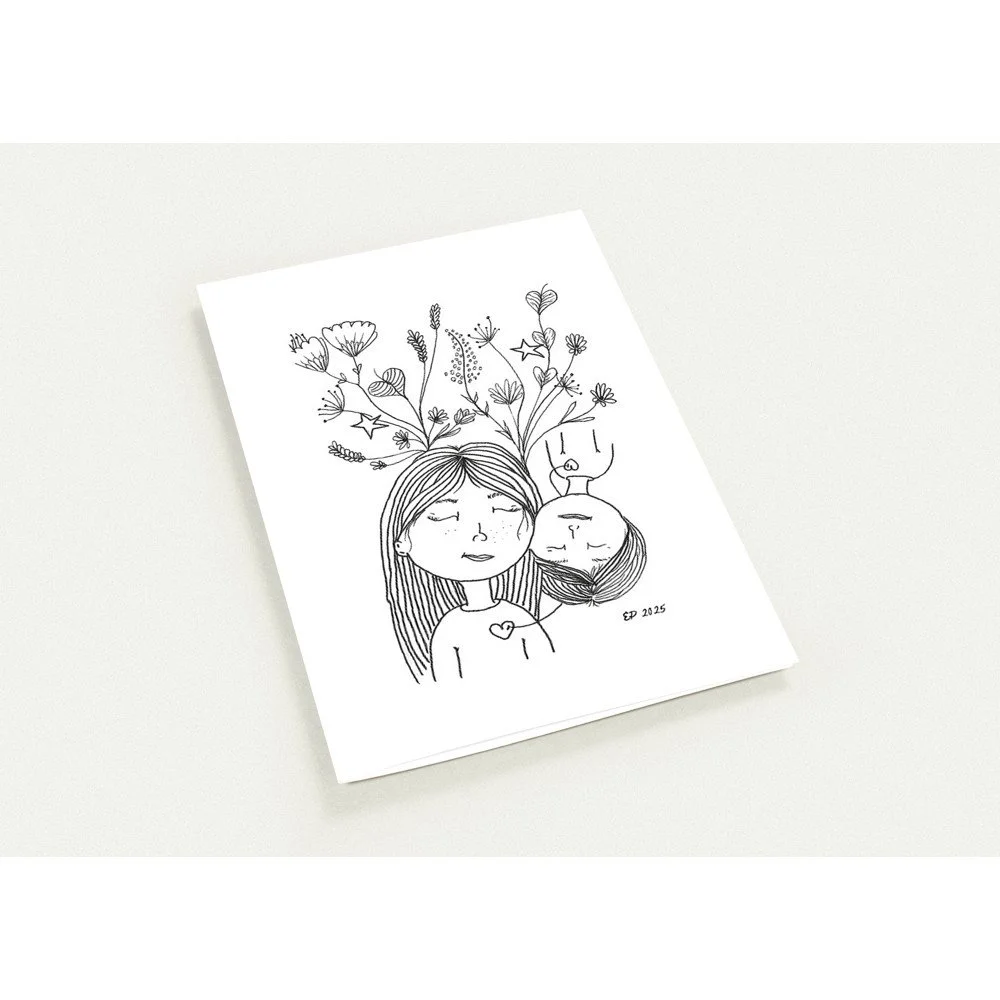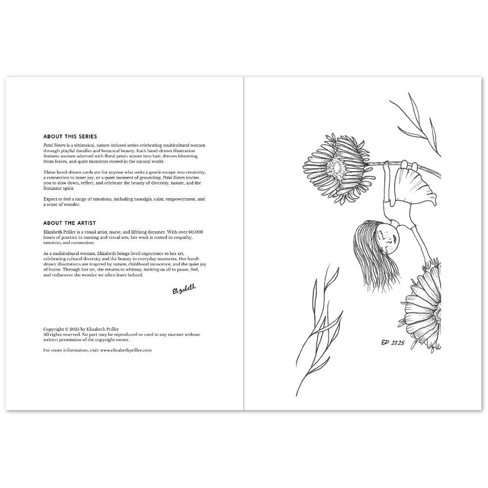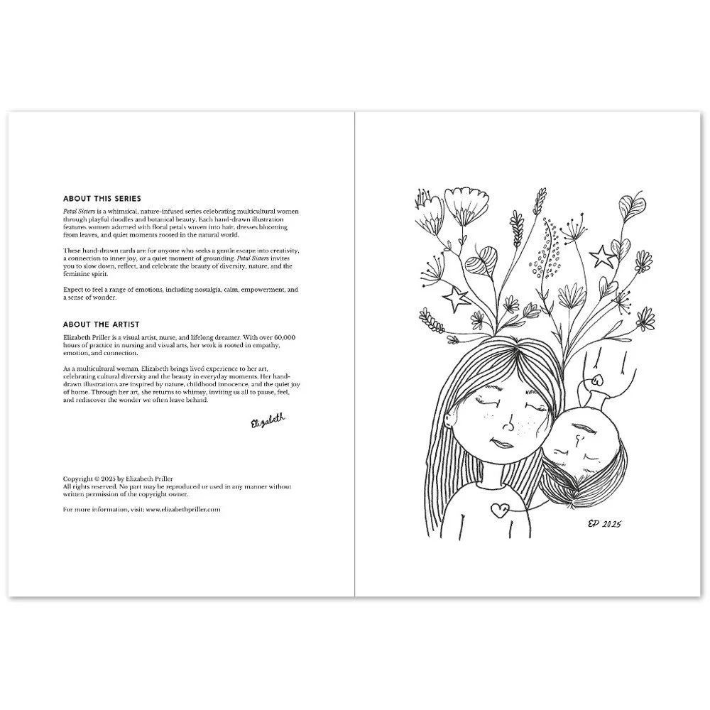 Petal Sisters ink illustrations are hand-drawn pieces inspired by nature, connection, and the strength of women. Available as premium cards or the full series in a coloring book, each whimsical design carries a sense of stillness and story, made to be left in black and white or brought to life with your color and meaning.