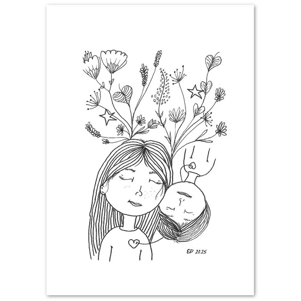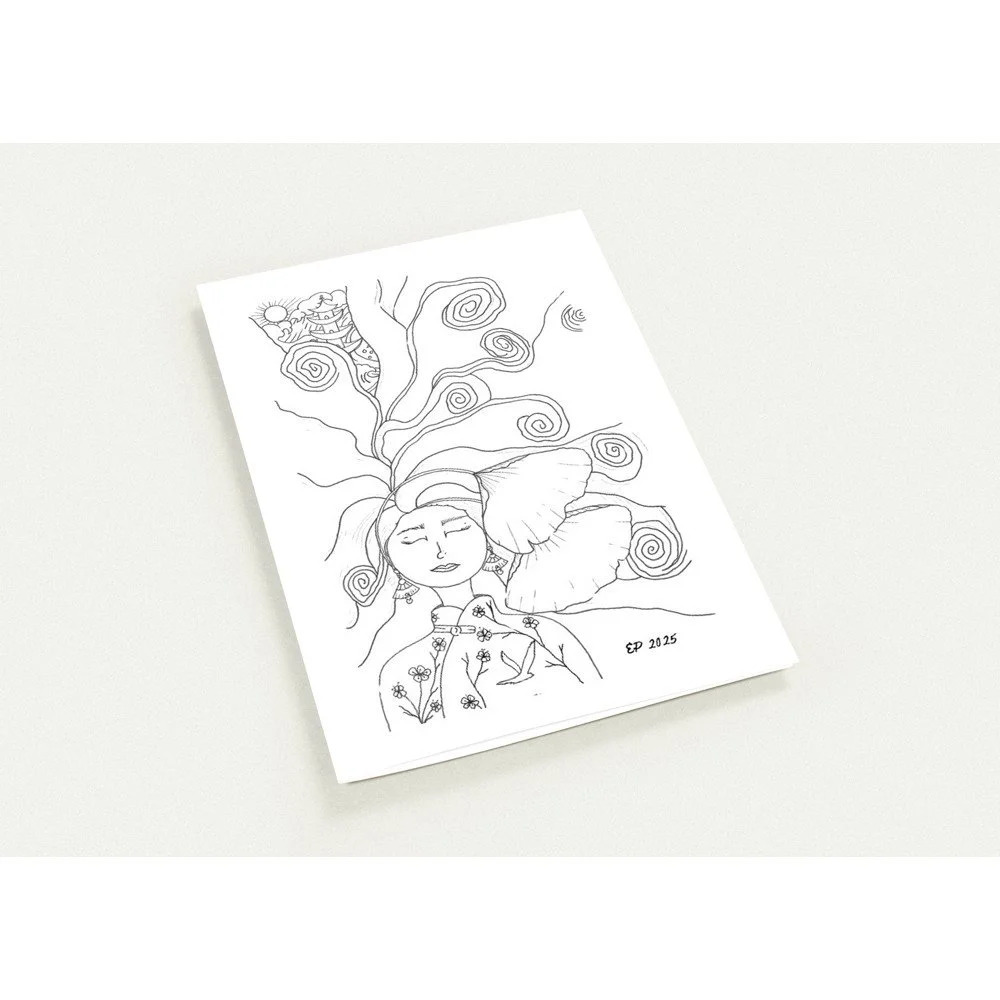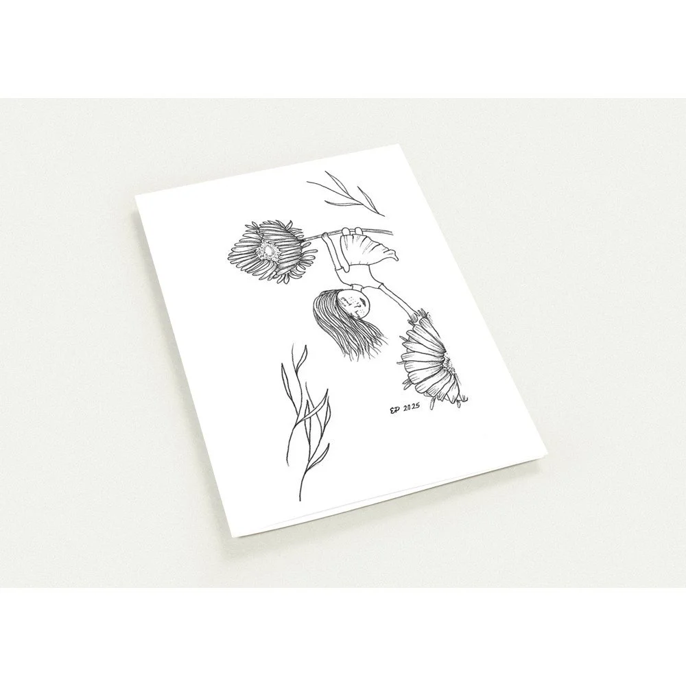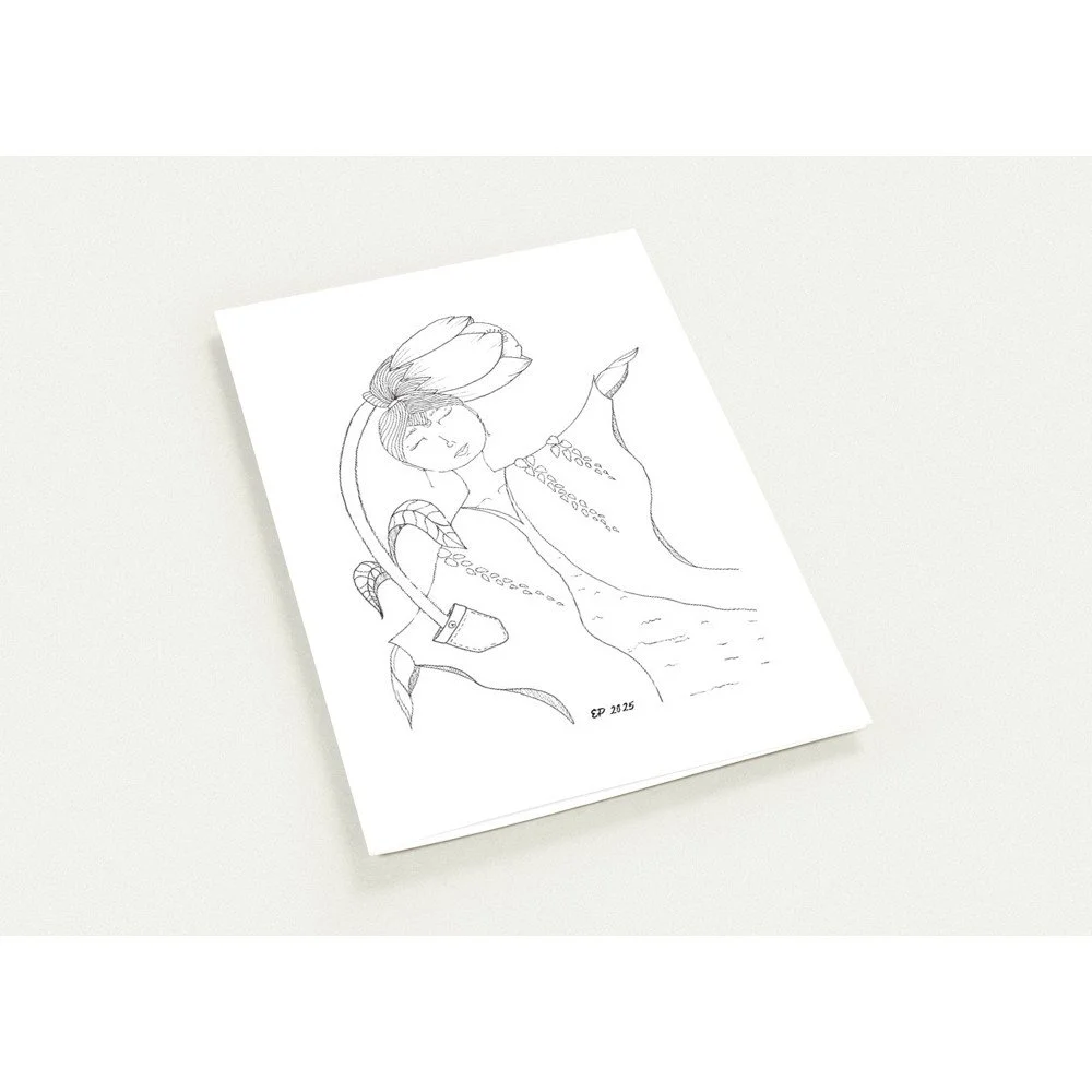 Petal Sisters ink illustrations are hand-drawn pieces inspired by nature, connection, and the strength of women. Available as premium cards or the full series in a coloring book, each whimsical design carries a sense of stillness and story, made to be left in black and white or brought to life with your color and meaning.