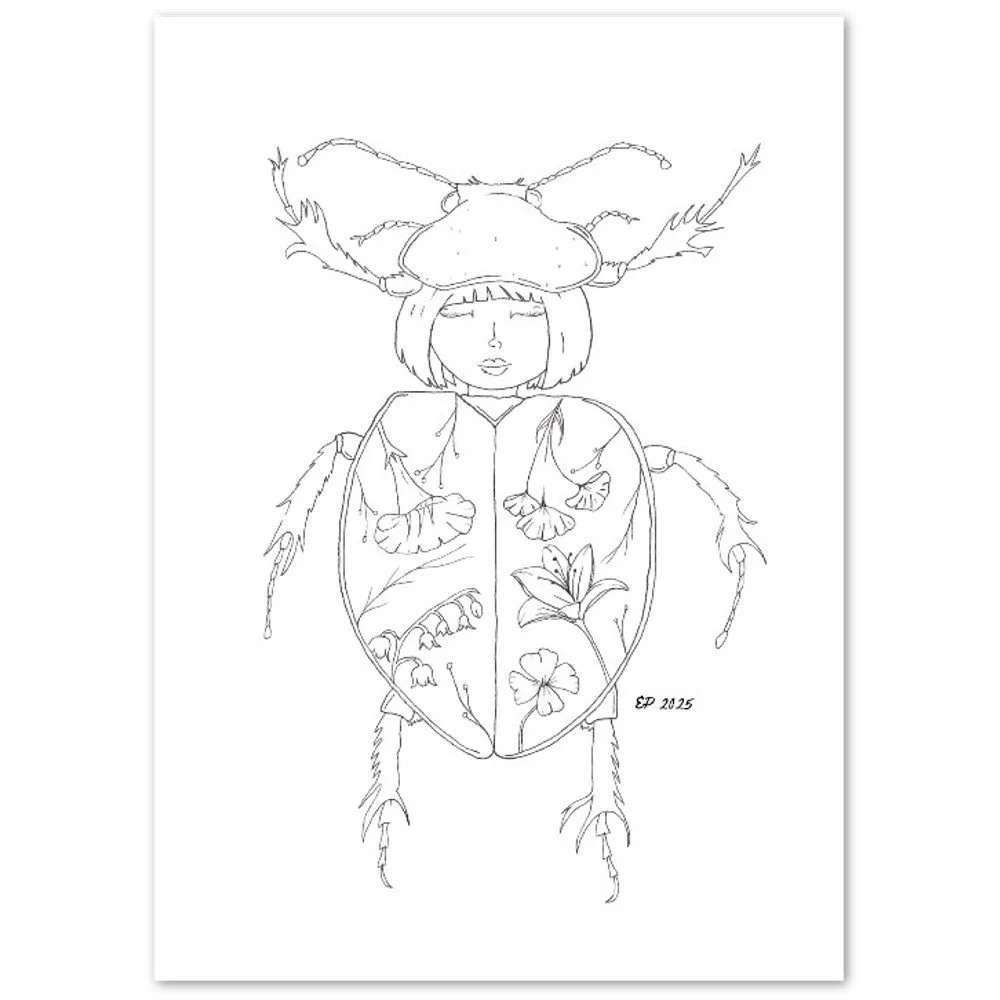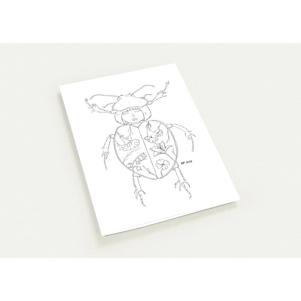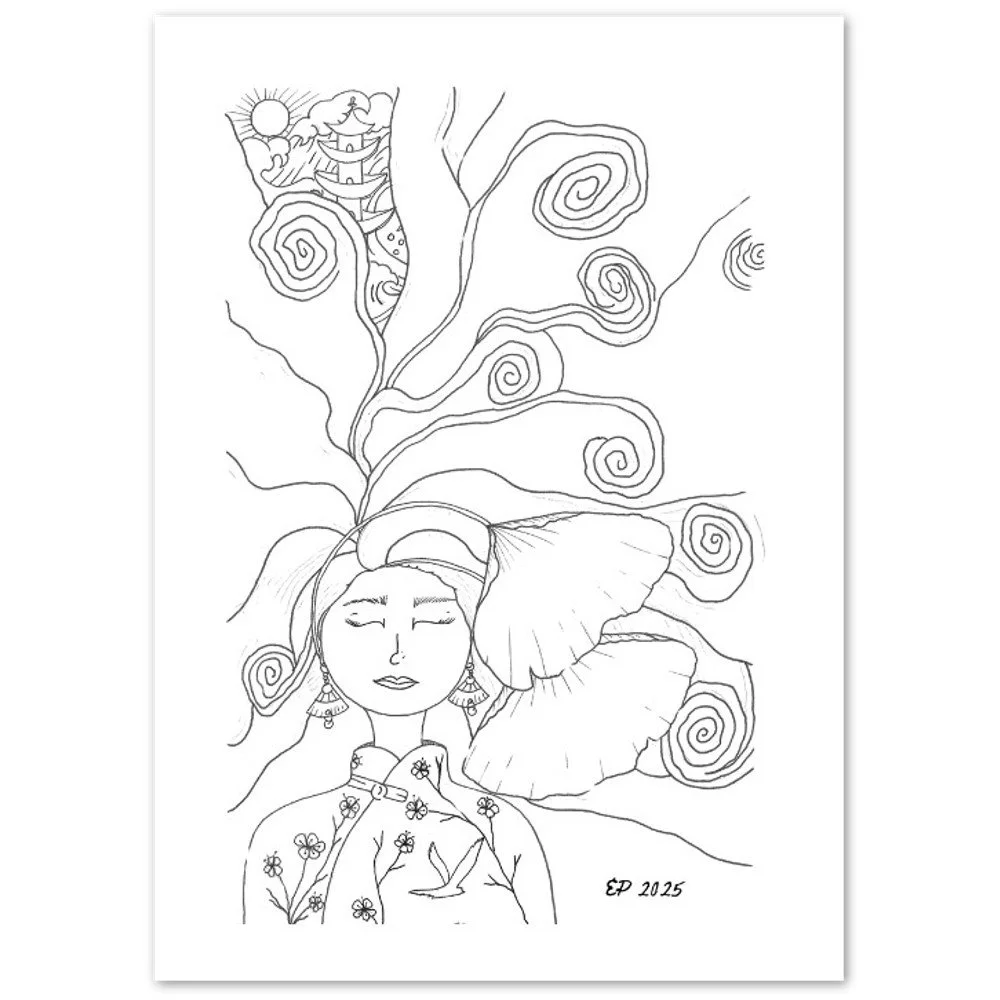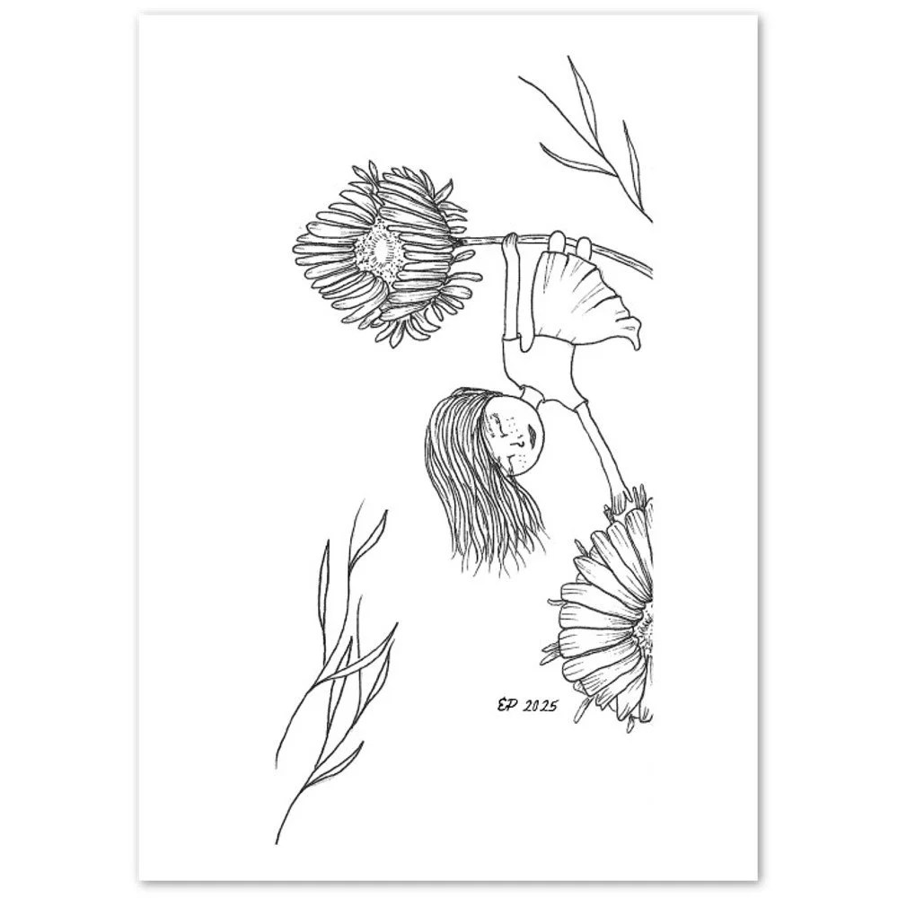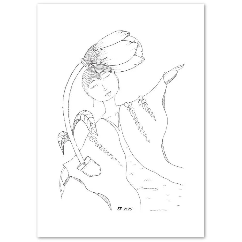 Petal Sisters ink illustrations are hand-drawn pieces inspired by nature, connection, and the strength of women. Available as premium cards or the full series in a coloring book, each whimsical design carries a sense of stillness and story, made to be left in black and white or brought to life with your color and meaning.